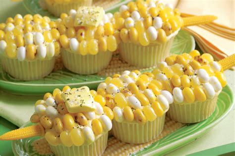 Corn Cob Cupcakes. These cupcakes are made to look like ears of corn. Cupcakes, baked and frosted 2 cups yellow (various colors) jelly bellys.
