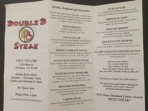 3,027 likes · 18 talking about this · 3,735 were here. The feature of this steakhouse is serving good antipasto salads, beef soup. Delicious steaks, seafood, chicken and pasta dishes! Home gallery visit reviews open menu close menu. Home gallery visit reviews eat. Web double d steak, fortuna, california. Web double d steak & seafood. #1 of 9 steak restaurants in fortuna. Here are some tips to enhance your visit: