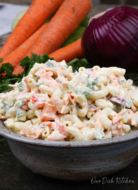Small Batch Macaroni Salad. Finely chop the red onion, celery, and bell pepper (red or green). 4.96 from 68 votes course: