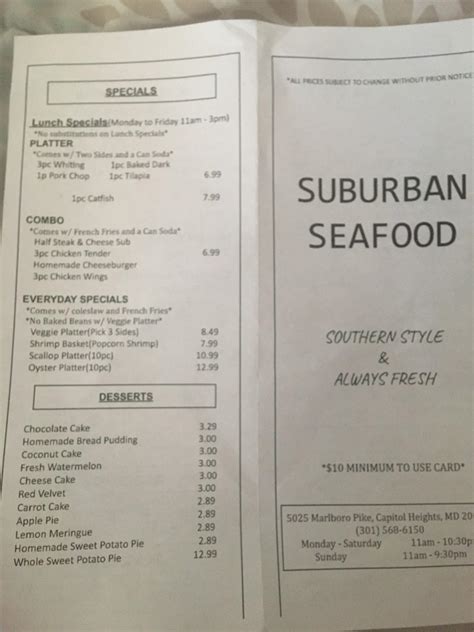 Suburban Seafood Menu. Prices and visitors' opinions on dishes. Web catfish and shrimp seafood combo plate with double mac and cheese seafood specials chicken box and dinner menu the small.