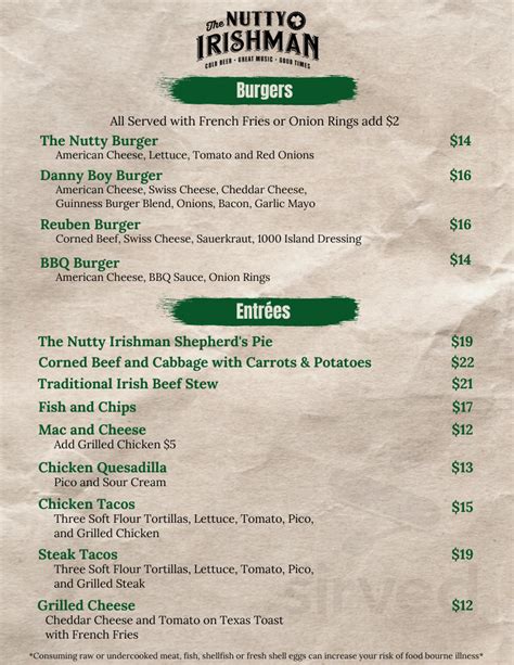 The Nutty Irishman Menu. “cold beer, great music and good times”, however, it is far more than that. Prices and visitors' opinions on dishes.